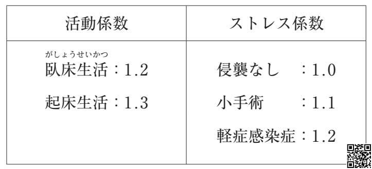 身長151cm、体重39kg、寝たきりで侵襲がない70歳の女性の基礎代謝量が980kcal と算出された。1日の必要エネルギー量は、基礎代謝量に活動係数とストレス係数を掛けることによって算出できる。
